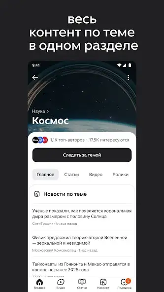 «Яндекс.Дзен» — приложение для чтения и ведения блогов, новостных статей, постов об искусстве, технологиях и любых сферах окружающего мира. Алгоритмы сервиса постепенно формируют ленту на основе заинтересованности пользователя — длительности чтения публикаций, посещаемые разделы, поиск по конкретным тегам и так далее. Приложение «Яндекс.Дзен» для Андроид предлагает выбор из более 30 тысяч блогеров, среди которых издания журналов, сообществ, авторские материалы.