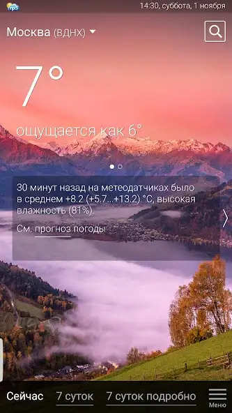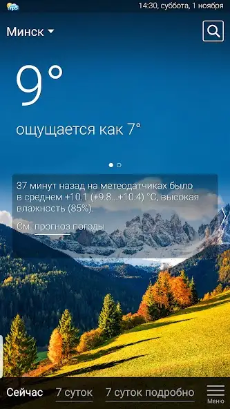 РП5 (Расписание Погоды) отображает все метеорологические сведения на главном экране Андроид, где красуется фоновый рисунок с текущим временем (если это вечер — закат, например, на фоне озера, рассвет — восход солнца). Можно выбрать интересующий населенный пункт, начав вводить его название. Умный поиск упрощает задачу. После город или поселок будут отображаться в списке избранных для быстрого просмотра прогноза: из перечня их можно легко удалить.