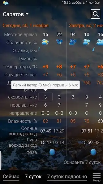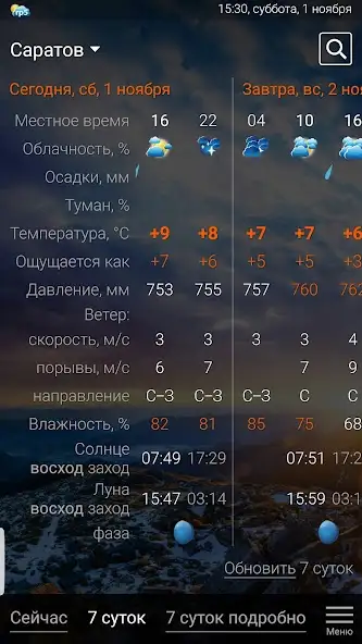 К характеристикам есть краткие комментарии, позволяющие пользователю точно оценить ситуацию, например: давление в норме, влажность повышенная. Информация из метеостанции обновляется регулярно и отображается время последнего получения свежих данных. Погода доступна не только на сегодня или завтра — можно изучить прогнозы синоптиков на любой из дней ближайшей недели. Предоставляются такие дополнительные данные: время восхода и заката солнца и луны, текущая фаза спутника.