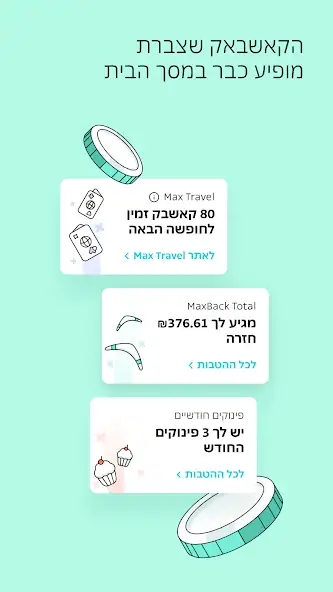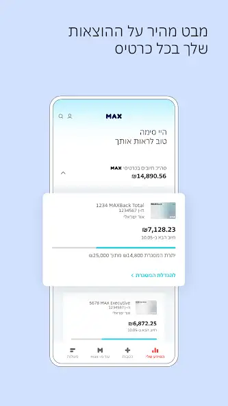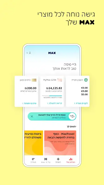 Max — личный кабинет владельца счета в одноименной израильской финансовой компании для проверки баланса, отслеживания сбережений, расходов, кредитов, оформленных страховых полисов, полученных вознаграждений, к примеру, баллов. Есть быстрый доступ к подарочным и предоплаченным картам, криптовалюте, другим инструментам. Можно выбирать тип сбережений, оформлять кредит, определять переменные или фиксированные платежи, обновлять, отменять их.