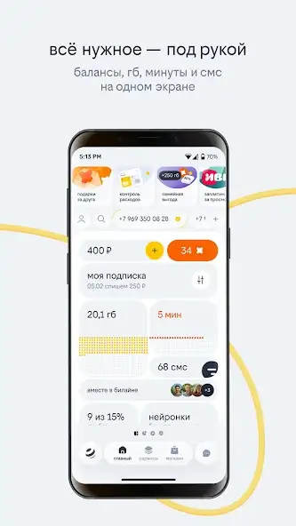 У приложения простой, но продуманный интерфейс. По умолчанию открывается вкладка «Главное», на которой отображается актуальная для пользователя информация: номер телефона, баланс, время, текущий тариф, подключенные услуги и мобильный интернет. Здесь же находится кнопка «Пополнить счет». При нажатии на нее открывается меню с разными вариантами оплаты: через ближайшие точки оплаты, банковскую карту, посредством доверительного платежа.