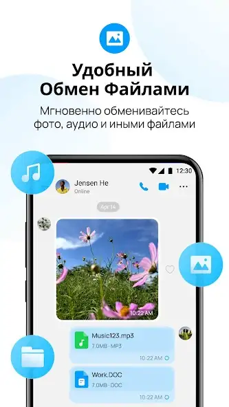 - Возможность делиться с собеседником файлами и различным мультимедийным контентом.