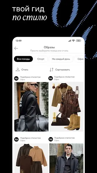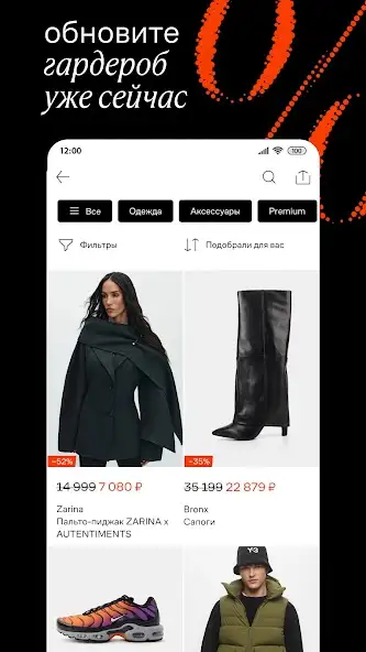 При входе в приложение открываются подборки сезонных коллекций, брендовой одежды и истории. Пользователь может просматривать актуальные предложения.