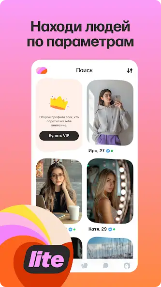 Mamba Lite — чат знакомств для поиска друзей или второй половинки. Позволяет соединяться по видеозвонку, назначать встречи, находить людей поблизости, общаться с иностранцами. Является облегченной версией одноименного приложения. Автоматически распознает и блокирует фейковую активность. Присутствуют уведомления о взаимных симпатиях, круглосуточная служба поддержки, настраиваемые фильтры, например, по материальному или семейному положению, встроенный поиск.