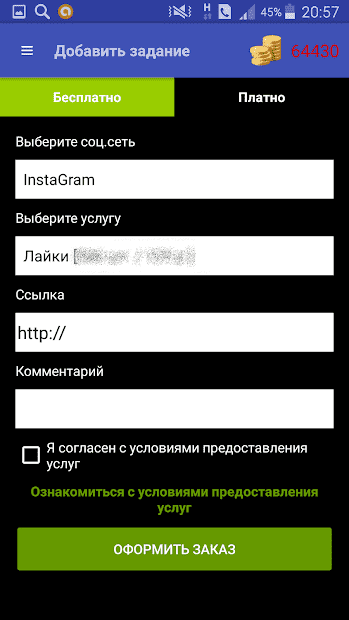 В платном варианте цели можно ставить и перед пользователями других соцсетей: «Одноклассники», «ВКонтакте», Телеграмм, Майл.ру и прочих. В этом случае заказы выполняются лишь после оплаты услуги реальными денежными средствами. Подобрав тип накрутки и ее размер, установив ссылку и комментарий, нужно завершить оформление задачи.