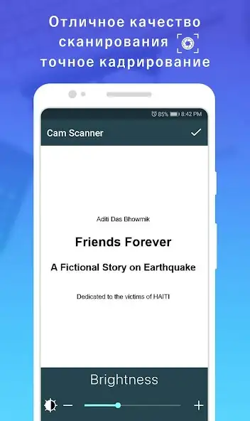 Позволяет импортировать фотографии из галереи устройства и конвертировать их в PDF-формат, вырезать часть документов для сканирования, накладывать фильтры, добавлять фразы. Можно настраивать яркость, переименовывать, удалять файлы, извлекать текст из изображения. Имеется встроенный поиск. Необходимо предоставить разрешение для камеры и хранилища. Есть реклама и покупки в приложении.