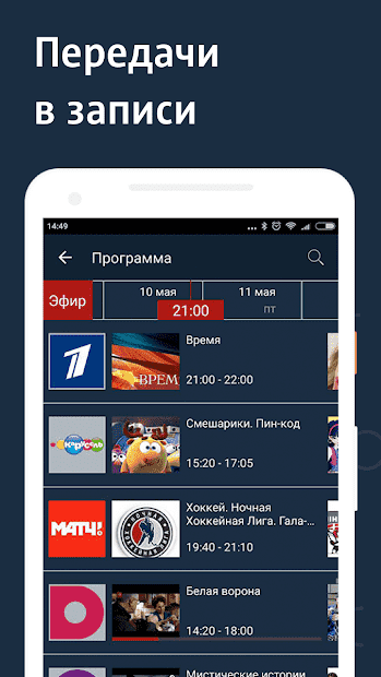- ТВ Каналы. В разделе находится список телевизионных трансляций. Пользователь может включить как отображение текущих передач, так и режим расписания. В расписании можно передвигать временную ленту и узнавать о предстоящих трансляциях. Присутствует поиск по названию.