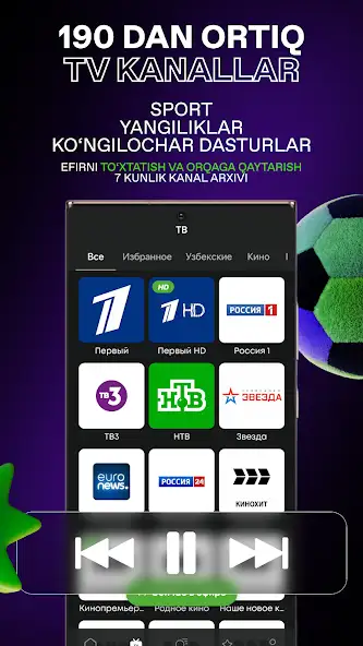 - Большое количество телеканалов. Присутствуют Ruxsor, BiZ Cinema, Bolajon, Mahalla, O’zbekiston Tarixi, Taraqquyot, Yoshlar, Sport, Toshkent и прочие.
