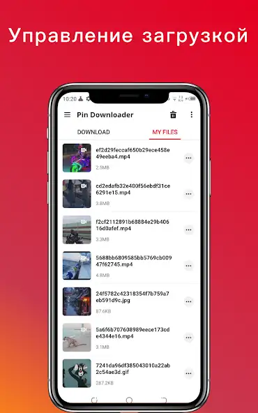 - Показом скачанных картинок, видеороликов в виде списка миниатюр с названиями, размерами во вкладке «Мои файлы».