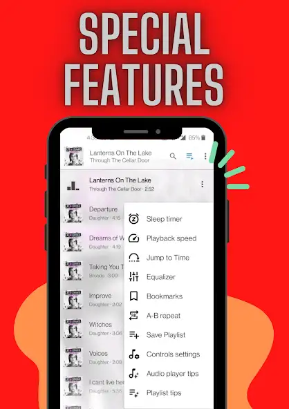 Есть таймер сна, обложка, эквалайзер и встроенный поиск с возможностью голосовых запросов. Имеются советы по использованию аудиоплеера и разделение контента на треки, жанры, альбомы, другие категории. Для работы необходимо предоставить доступ к микрофону и медиафайлам на устройстве. Медиаконтент представлен в виде списка миниатюр. Есть светлая и темная темы. Присутствует реклама.