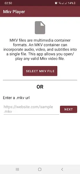 MKV Video Player & Converter — видеопроигрыватель с функцией конвертера для воспроизведения, конвертации файлов одноименного формата. Есть декодирование видео, проигрывание клипов в полноэкранном режиме. Доступны выбор видеофайлов с локального диска на устройстве и ввод URL-адресов. Можно использовать паузу, возобновление проигрывания, перематывание вперед-назад. Есть поиск, перечень загрузок, показ файлов как список миниатюр с названиями, датами, размерами.