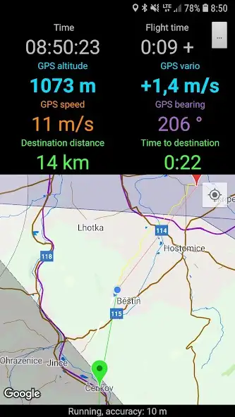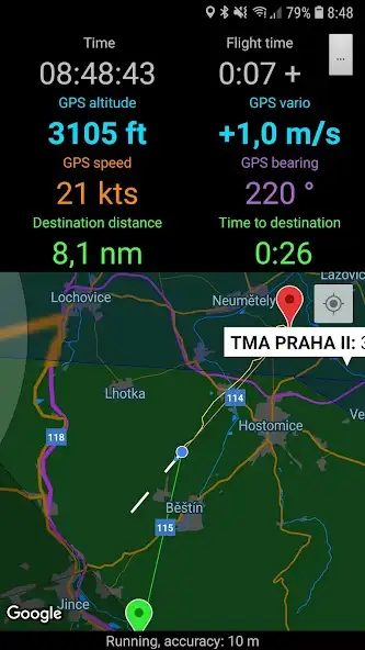Экран программы возвращается на передний план после нажатия кнопки. Доступны визуализация воздушного пространства, запись маршрута и экспорт в формате KML. Приложение подходит для использования при перелете на дельтапланах, парапланах, других летательных аппаратах. Поддерживаются форматы данных OpenAIP, AIXM. Можно узнавать информацию об аэропортах. Есть функция отправки местоположения членам группы, загрузка рейсов на сервер xcontest.org.