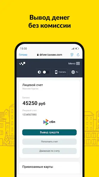 - Главная особенность — перевод денежных средств другим водителям, работающим в такси. Нужно указать мобильный номер и сделать перевод.