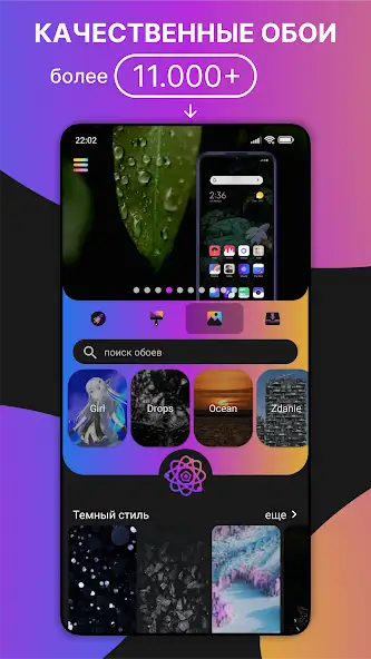 Обои показываются как список миниатюр с названиями, тегами.Есть функции поиска и предварительного просмотра, категории, перечень загрузок. Присутствуют уведомления. Можно подбирать темы с помощью встроенного алгоритма, скачивать, устанавливать и отправлять их другим пользователям. Есть реклама, темная тема, интерфейс на русском языке, рекомендации похожих изображений. Доступен просмотр размера файлов. Присутствует список популярных фонов.