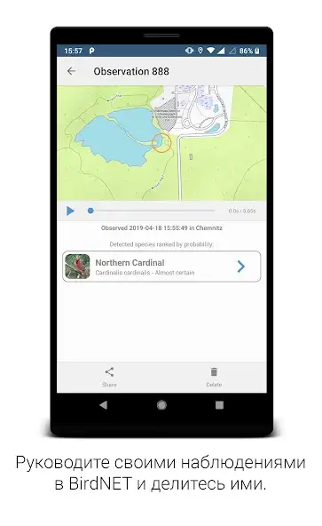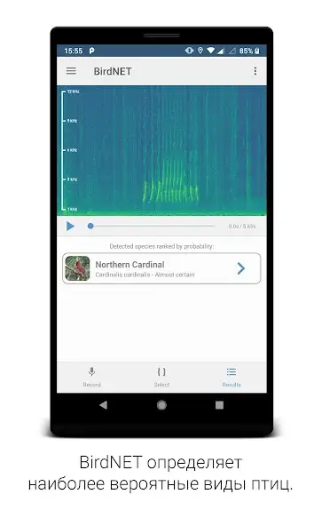 Возможно узнавать, какие подвиды распространены в местности нахождения пользователя, записывать аудиофайлы через микрофон телефона или планшета, выбирать интервал записи, смотреть его длительность и размер. Можно анализировать и сохранять записанные файлы, воспроизводить их, ставить на паузу, заходить в историю сохранений, делиться контентом через интернет.