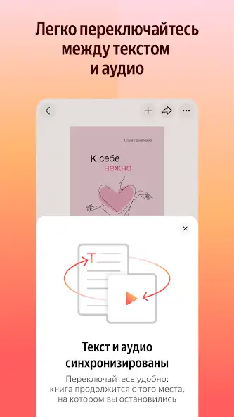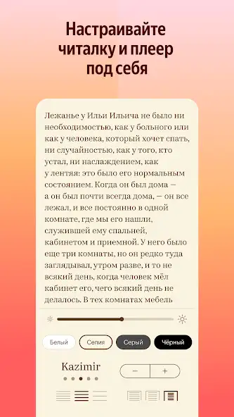 Главный плюс приложения – синхронизация текстовой и звуковой версий. Пользователь может начать слушать аудиокнигу с момента остановки во время самостоятельного чтения.
