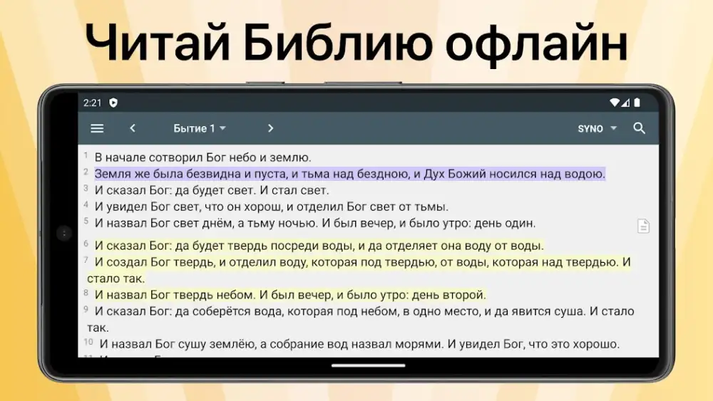 «Библия: синодальный перевод» — электронная книга с функцией аудиоплеера для чтения, прослушивания православного Священного Писания. Присутствуют Ветхий и Новый Заветы, второканонические книги, например «Премудрость Соломона». Можно использовать маркеры, делать заметки, добавлять страницы в закладки, использовать планы чтения. Доступны: создание плейлистов, регулирование скорости воспроизведения и поиск по тексту. Программа сохраняет историю.