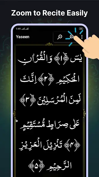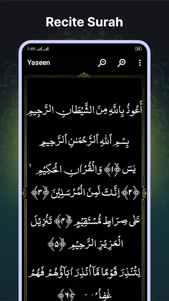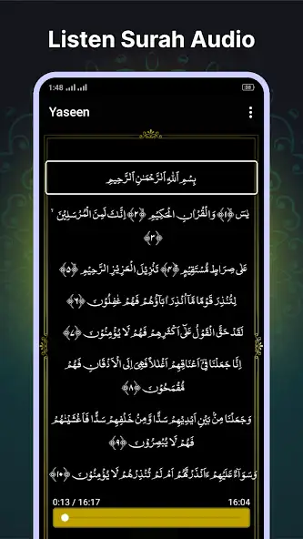 Сура Ясин — электронная книга для изучения тридцать шестой главы Священного Корана. Позволяет читать построчно на арабском языке, увеличивать и уменьшать масштаб текста. Можно узнавать произношение слов. Присутствует аудиоверсия файла в формате MP3, где указана продолжительность аудиозаписи и отображаются озвучиваемые фразы. Воспроизведение возможно ставить на паузу. Функционирует без подключения к интернету. Доступен платный контент. Имеется реклама. Есть темная тема. Русскоязычный интерфейс отсутствует.