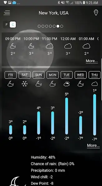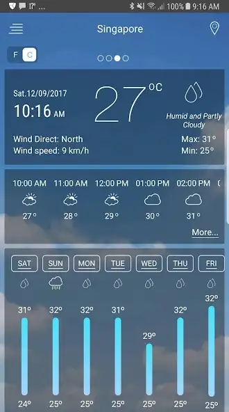 Доступен выбор формата измерения температуры, скорости, направления ветра. Есть новости, показ времени восхода и заката солнца согласно часовому поясу, сигнализация дождя. Имеется блокировка экрана с информацией. Доступно получение метеорологических предупреждений об аномальных погодных условиях три раза в день. Есть функции обратной связи и автоматического определения страны. Имеется резервная копия информации с AccuWeather.