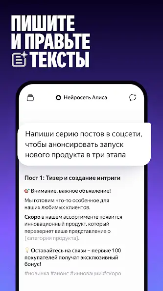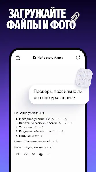 «Алиса: AI-ассистент» — нейросеть для помощи в решении задач, например, по учебе или работе. В чате с искусственным интеллектом (ИИ) можно записывать и редактировать тексты, получать ответы на вопросы, писать программный код. Возможна работа с файлами разных форматов, таких как DOC, DOCX, PDF, TXT. Есть режим рассуждений, в котором нейросеть анализирует запросы на экспертном уровне. Присутствует голосовой ввод. Доступна профессиональная версия, где возможно общаться с ИИ через камеру в live-режиме.