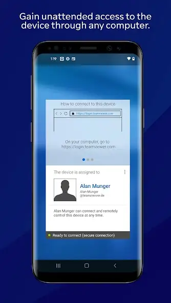 Возможны удаленое управление, просмотр и удаление программного обеспечения. Доступно ознакомление с информацией об устройствах. Можно узнавать способы подключения, смотреть стадии подготовки соединения и кому принадлежит аппарат. В TeamViewer Host вход осуществляется с помощью адреса электронной почты, имени, пароля. Возможно получение, передача Wi-Fi-настроек.