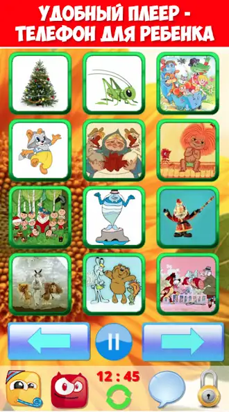 «Детские песни» — плеер для прослушивания музыкальных файлов. Присутствуют треки из мультфильмов, например: «Песенка Буратино», «Колыбельная медведицы», «Два веселых гуся». Работает без доступа к Интернету. Контент представлен в виде кнопок с картинками. Воспроизведение можно ставить на паузу и повтор, включать предыдущую или следующую композицию, используя экранные стрелки. Фоновый режим отсутствует. Доступны тексты аудиофайлов, блокировка экрана. Есть реклама.
