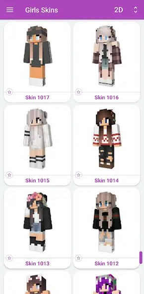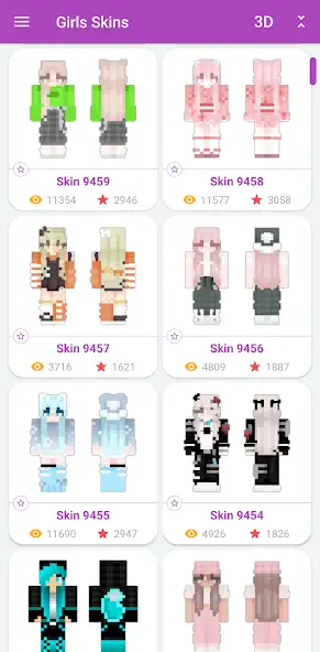 «Скины девочек для Майнкрафт» — каталог образов, позволяющий загрузить в песочницу Minecraft более 10000 женских обликов. Присутствуют нубы, военные, герои с наушниками, прочие персонажи в трехмерном и двухмерном форматах. Можно добавлять внешние виды к избранным вариантам, просматривать их перед установкой, сохранять в галерею устройства. Имеются встроенные фильтры по просмотренным и отобранным в предпочтения обличьям. Есть реклама. Функция поиска отсутствует. Контент представлен списком миниатюр с указанием названий элементов, количества просмотров и лайков.