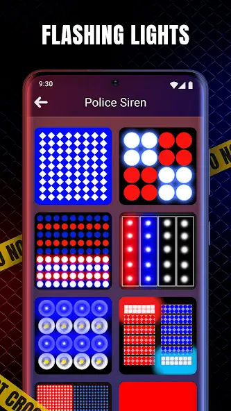 «Громкий звук сирены полиции» — каталог аудиофайлов и специальных эффектов для имитирования звучания сигналов полицейских автомобилей, внешнего вида проблесковых маячков. Аудиодорожки показываются в виде списка с названиями, миниатюрами, продолжительностью. Есть функции проигрывания и паузы, эквалайзер, кнопка Random. Мерцающие огни отображаются как список миниатюр. Доступна кастомизация свето-звуковых сигналов путем выбора цвета, скорости анимации и проигрывания аудиозаписи.