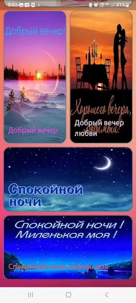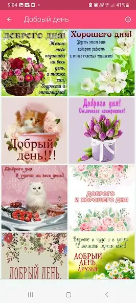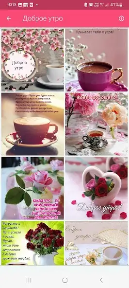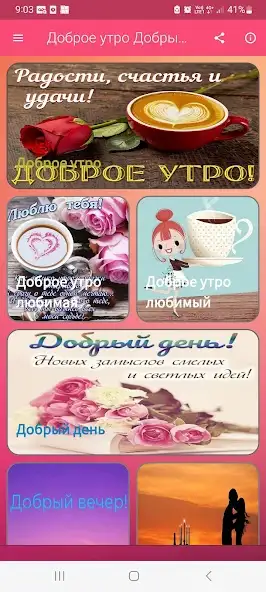 «Доброе утро, день, вечер» — коллекция открыток с приветствиями, любовными признаниями, пожеланиями спокойной ночи, сладких снов, хорошего настроения, прочими. Контент разделен на категории по назначению, показывается в виде списка миниатюр. Присутствуют картинки с цветами, пейзажами, кружками горячих напитков, сердцами, животными и прочие.