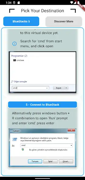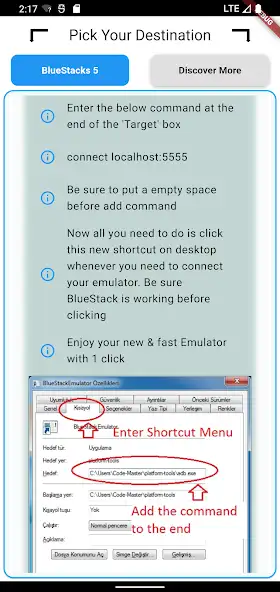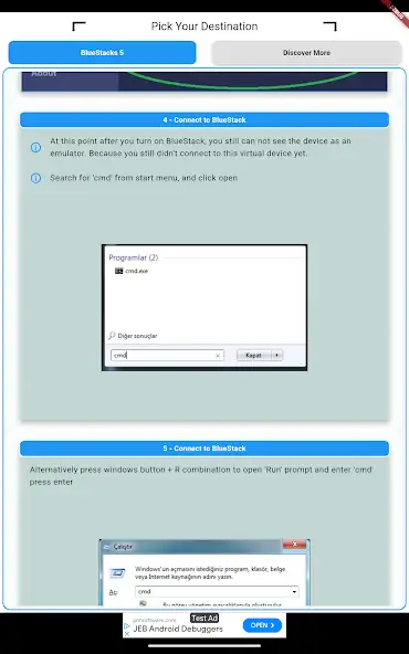 BlueStacks — руководство по использованию одноименного эмулятора для развертывания, тестирования разработанного программного обеспечения. Присутствуют поэтапная инструкция, пояснения и изображения с пометками. Имеется вступление. Есть реклама, светлая тема, кнопки Discover More и Downloads. Интерфейс на русском языке отсутствует. Доступны описания среды выполнения Windows Subsystem (WSA) и эмуляторов GameLoop, LDPlayer, Genymotion, Koplayer, NoxPlayer, MEmu Play, которые отображаются в виде списка.