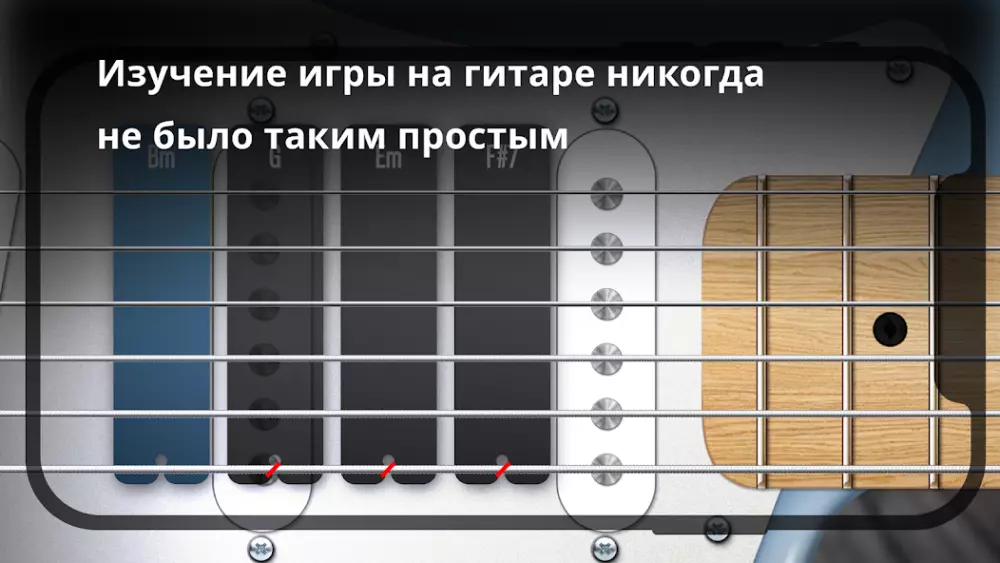 Во время работы программы экран устройства превращается в гитарный гриф, работать в нем можно в режиме мультитач, что позволяет использовать практически все возможные аккорды.