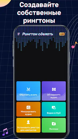 «Создатель рингтона» — аудиоредактор для обрезки, объединения или микширования музыки. Позволяет создавать мелодии для персонализации звонков, СМС, уведомлений, будильника. Возможно устанавливать аудиофайлы в качестве сигнала вызова отдельных контактов или SIM-карт, делиться контентом с друзьями через Сеть, регулировать громкость музыкальных композиций, дублировать видеозаписи.