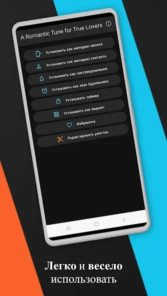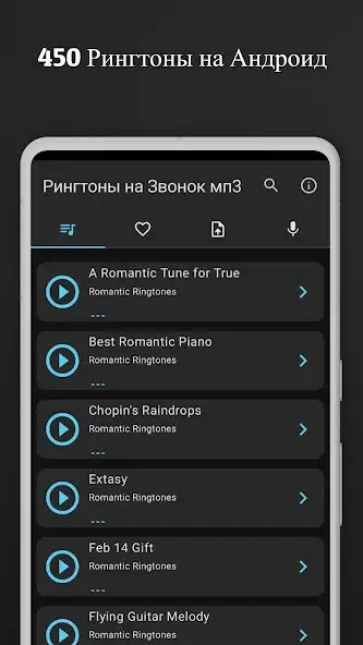 «Рингтоны на звонок MP3» — каталог аудиофайлов с функцией редактора мелодий для персонализации звуков вызовов, уведомлений, СМС-сообщений, будильника. Есть романтические музыкальные композиции, ретромузыка, смешные звуки и прочие аудиодорожки. Присутствуют 450 рингтонов. Аудиозаписи отображаются как список миниатюр с названиями файлов, наименованиями коллекций. Можно устанавливать отдельные мелодии для контактов, отправлять ссылку на приложение другим пользователям, смотреть политику конфиденциальности.