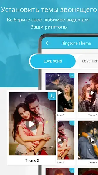 «Видео рингтон для звонка» — редактор, где можно создавать, устанавливать ролики в виде экранов вызовов отдельных или всех контактов. Темы кнопок отображаются как список миниатюр. Имеются шаблон видеоконтента, встроенный видеоплеер. Возможна обрезка фрагментов публикаций. Есть реклама, русскоязычный интерфейс. Доступны импорт контента из галереи устройства, включение, отключение проигрывания клипа. Поддерживается HD-разрешение материалов. Присутствуют возможность настройки звука, функции «Поделиться» и «Скачать».
