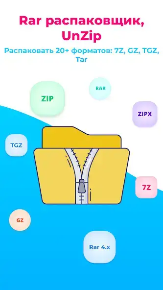 Aрхиваторы Zip Rar распаковщик» позволяет создавать или распаковывать более двадцати разных видов архивов: TGZ, 7Z, ZIPX, прочих. Дает возможность упаковать изображения, аудиозаписи, текстовые документы, электронные таблицы и другие типы файлов, сократив их вес до семидесяти процентов без потери качества.