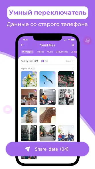 Позволяет передать документы, медиафайлы, заметки, контакты, другие типы данных. Есть автоматический поиск файлов с разбивкой по видам: изображения, видео, музыка и так далее. Имеется платная подписка. Разрешается вручную указать файлы, которые нужно передать. Дает доступ к облачному хранилищу для создания резервной копии.