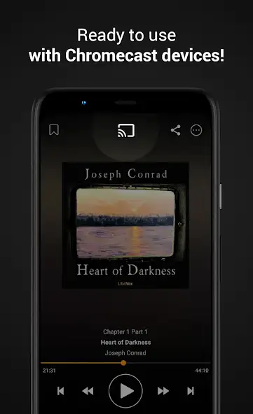 Приложение Аудиокниги содержит рекламу. Есть темная тема, уведомления. Можно устанавливать таймер сна, контролировать скорость воспроизведения, смотреть номер прослушиваемой главы. Присутствует поддержка технологии Chromecast. Доступен поиск контента по авторам, названиям. Загруженные материалы можно прослушивать в автономном режиме. Имеется премиум-подписка, которая убирает рекламу.
