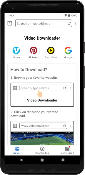 Video Downloader — менеджер загрузок для сохранения видеозаписей без водяных знаков, их просмотра онлайн или офлайн. Присутствует встроенный видеоплеер и браузер, автоматически определяющий контент для скачивания. Поддерживает многопоточное сохранение файлов, MP4, AVI, MOV и другие форматы. Не загружает видеоконтент из YouTube. Функционирует в фоновом режиме. Есть реклама.