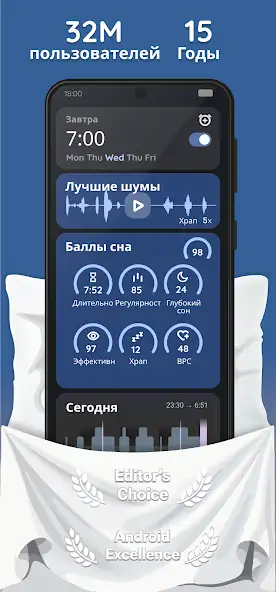 Позволяет видеть статистику сонного процесса, например, оценивать его дефицит, регулярность и фазы, определять хронотип. Можно воспроизводить песни из плейлистов Spotify, засыпать под колыбельные, звуки природы, включать ограничение на отсрочку звонка будильника или задания для его отключения. Имеются советы, тренды и теги. Совместим с Pixel Watch и прочими устройствами. Поддерживает Samsung Health, Google Календарь и другие сервисы. Есть пробный семидневный период и платная премиум-версия программы.